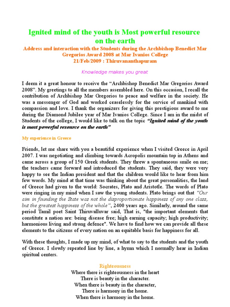Abdul Kalam Speech On Youth