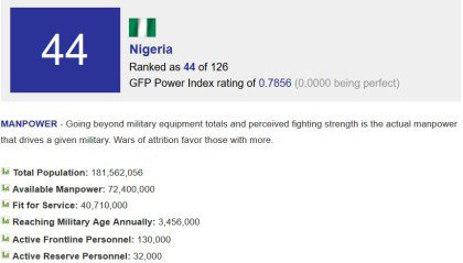 Nta News On Twitter Global Fire Power Nigerian Military Ranked 44th Out Of 126 Countries Https T Co 6wqnlzbc0k - The smaller the pwrindx value, the more powerful a nation's theoretical fighting capability is (by conventional means as nuclear capability is not taken into account).