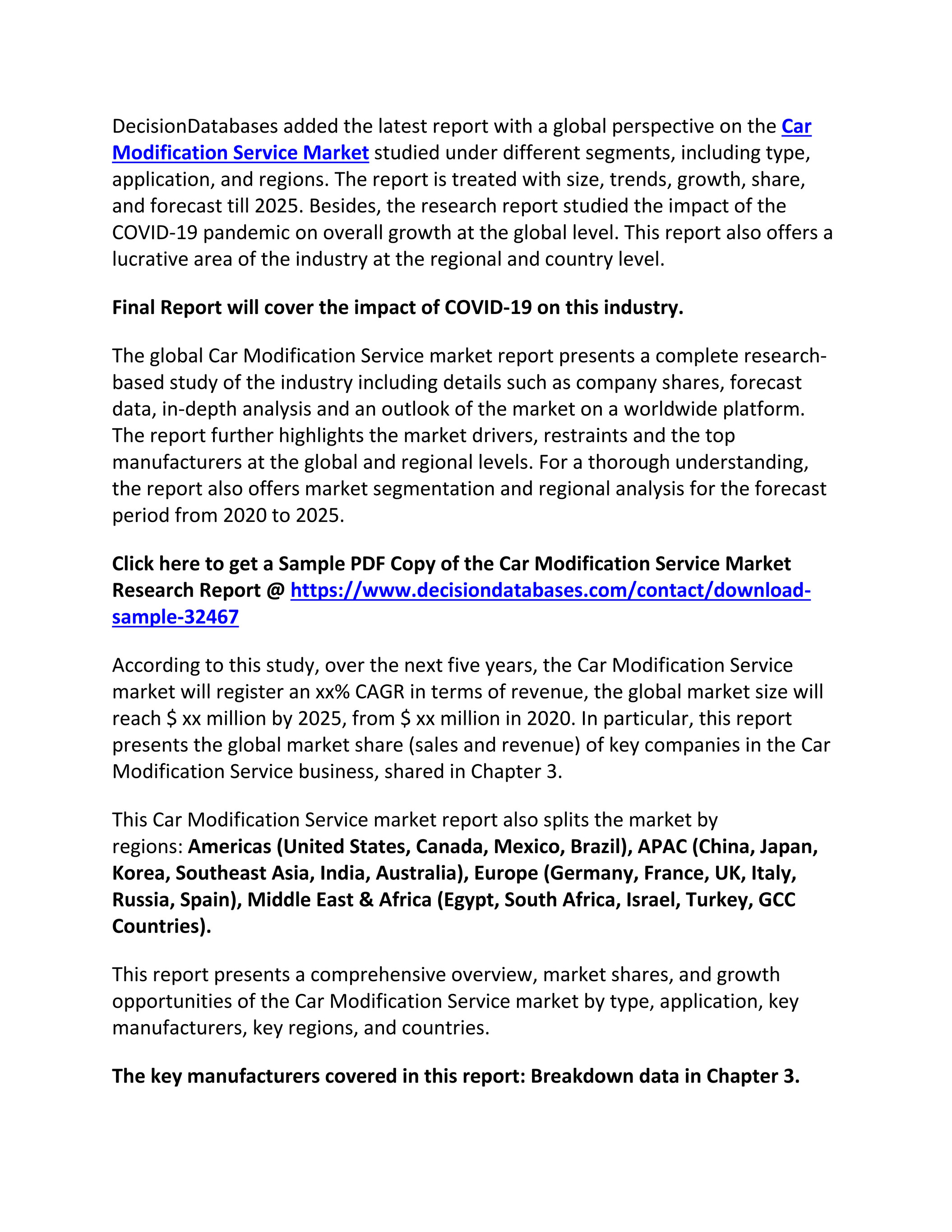Car Modification Service Market Report From 2021 To 2026 Decisiondatabases Page 1 - (learn more about how to start a mobile detailing business here.) you will need to think about what business type and location makes sense based on your research, for the customers you.